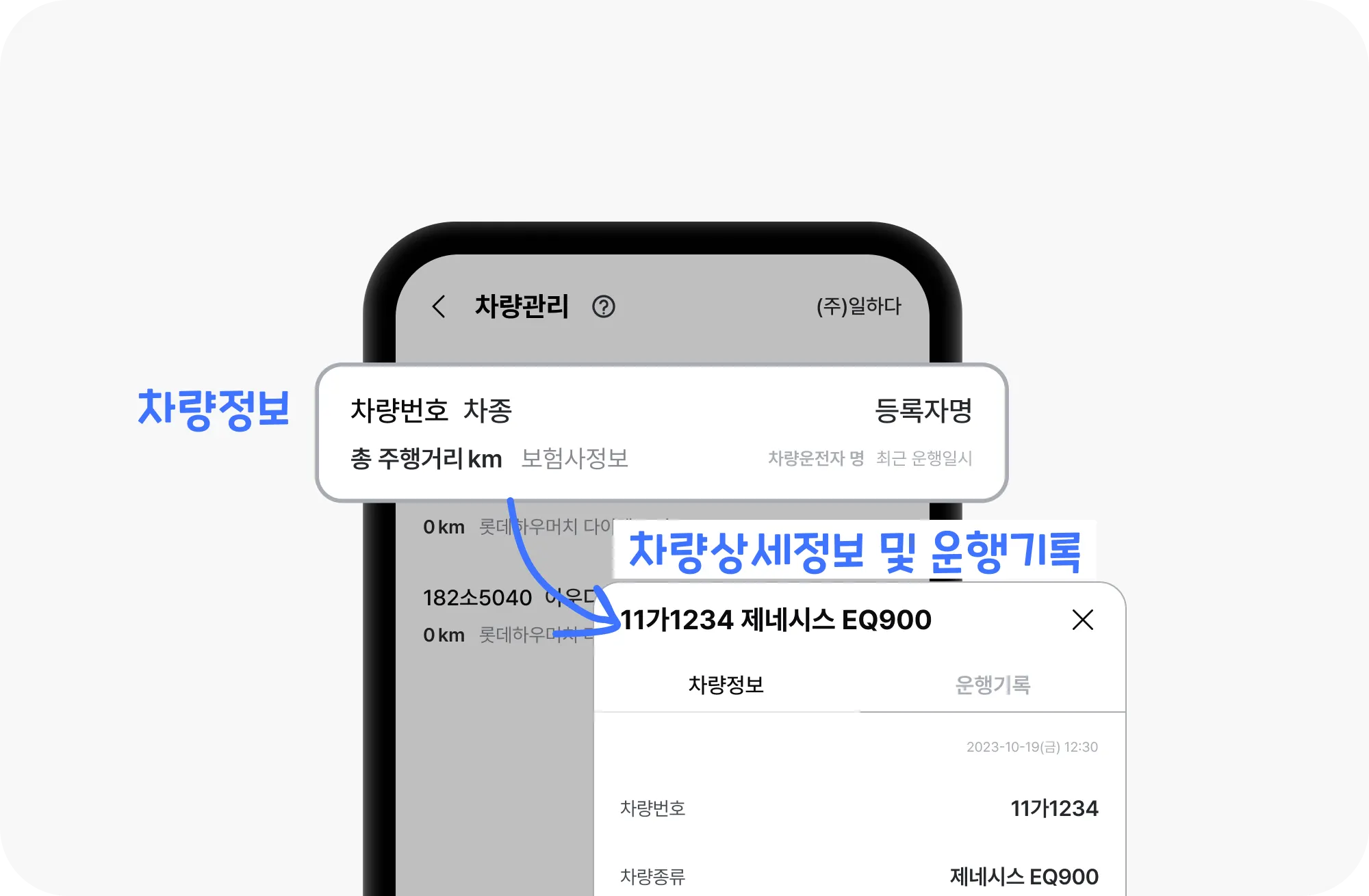 법인차량을 등록 및 관리하는 메뉴입니다. 차량별 차량상세정보를 확인하고, 직원이 등록한 운행기록을 확인할 수 있어요.