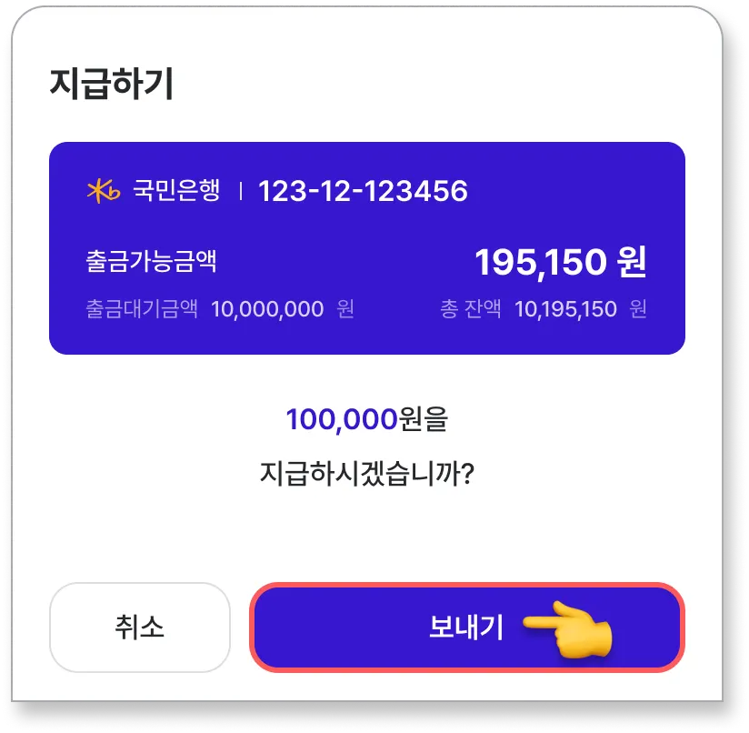 실시간지급계좌의 출금가능액과 최종 지급금액을 확인합니다. ‘보내기’를 선택합니다.