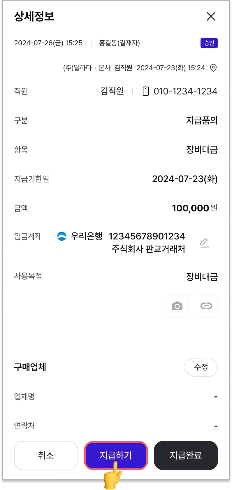 결재문서를 최종 확인 후 ‘지급하기’를 선택합니다.