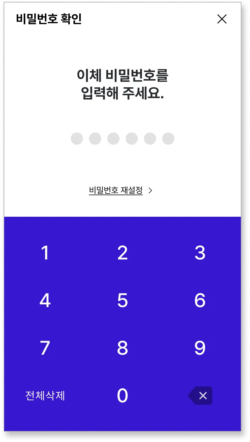 설정된 이체비밀번호를 눌러 이체를 완료합니다.
