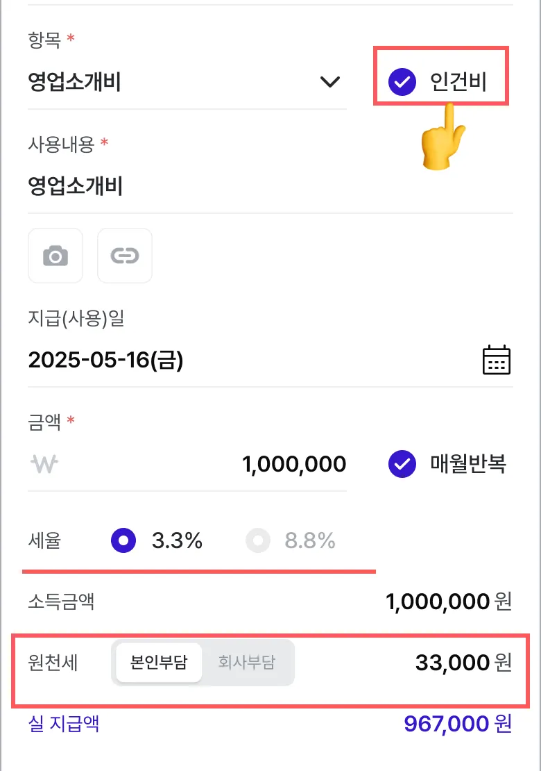 본인부담: 약정한 금액에서 선택된 세율x금액을 차감 후 금액을 지급하는 경우로 소득금액이 약정한 금액과 동일합니다.