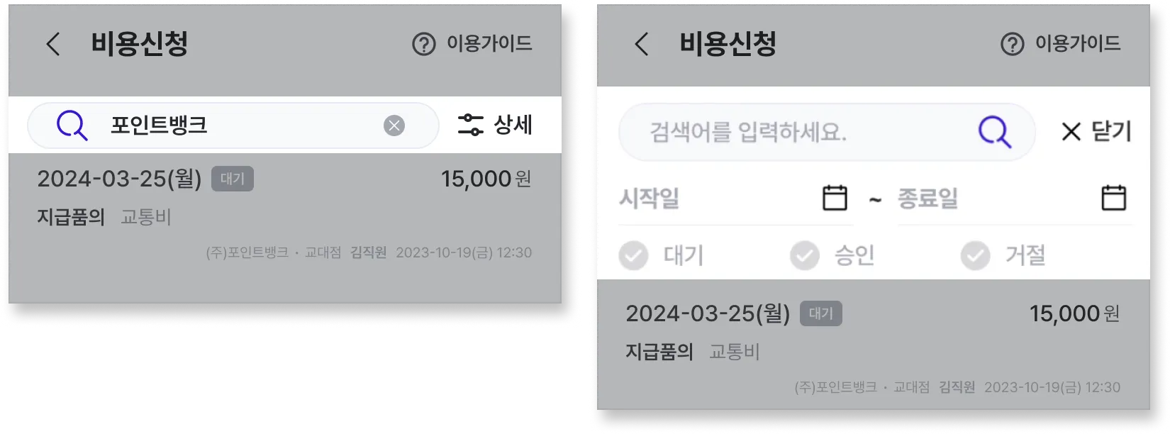 검색어 입력 또는 기간 조회 찾고자 하는 비용신청을 조회할 수 있어요!