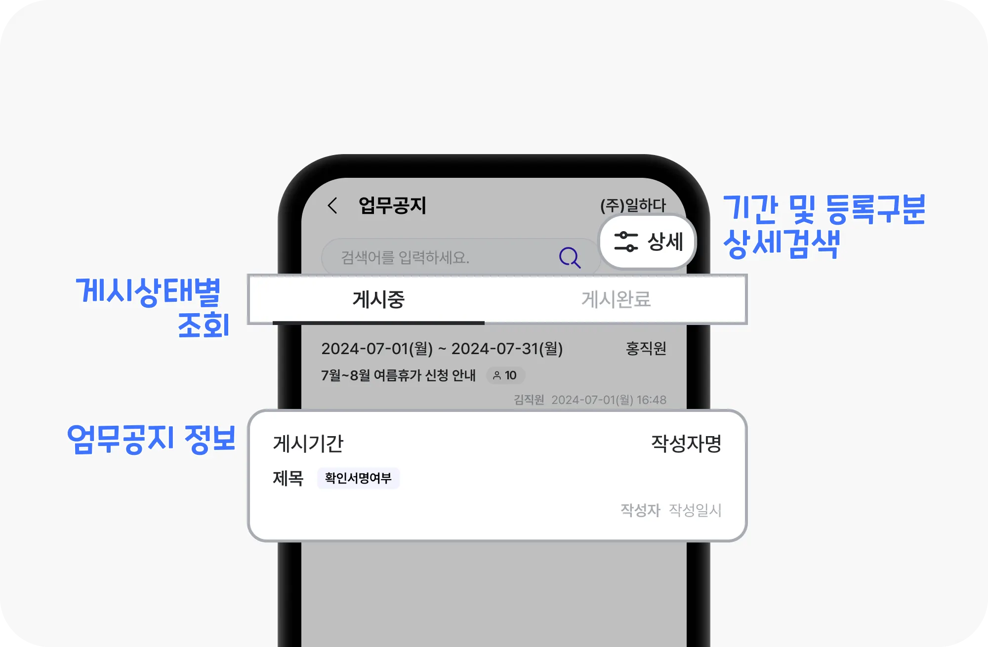 직원에게 전달할 공지나 업무사항을 등록합니다. 확인서명여부를 설정하여 업무의 효율을 높일 수 있습니다.