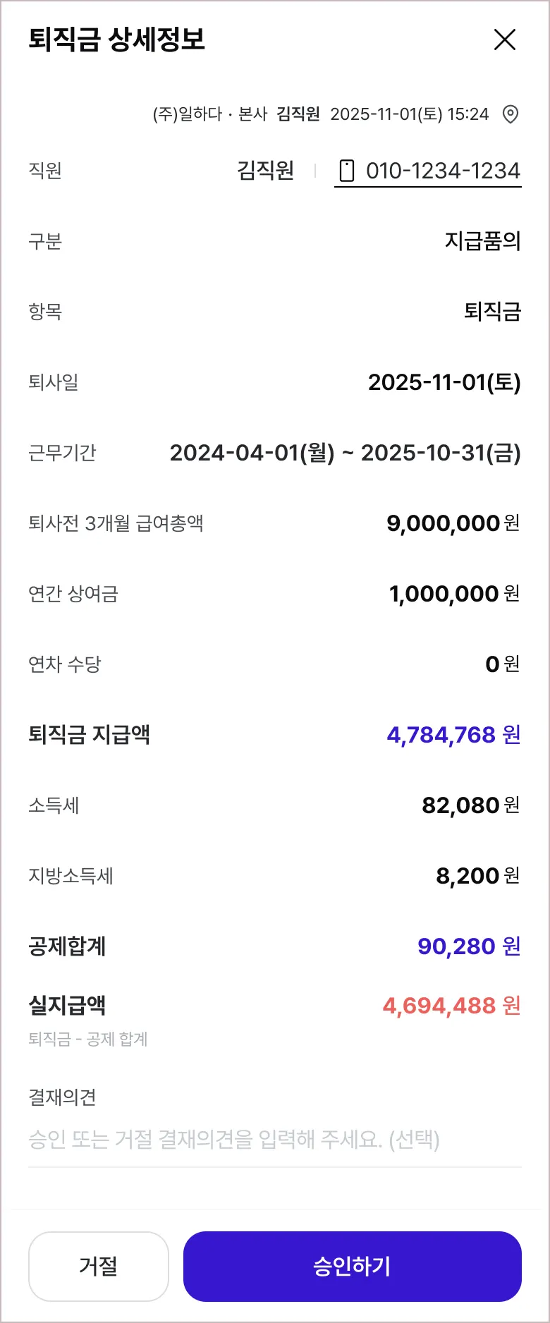 지급신청된 퇴직금 내역을 확인후, ‘승인’ 또는 ‘거절’을 선택합니다.