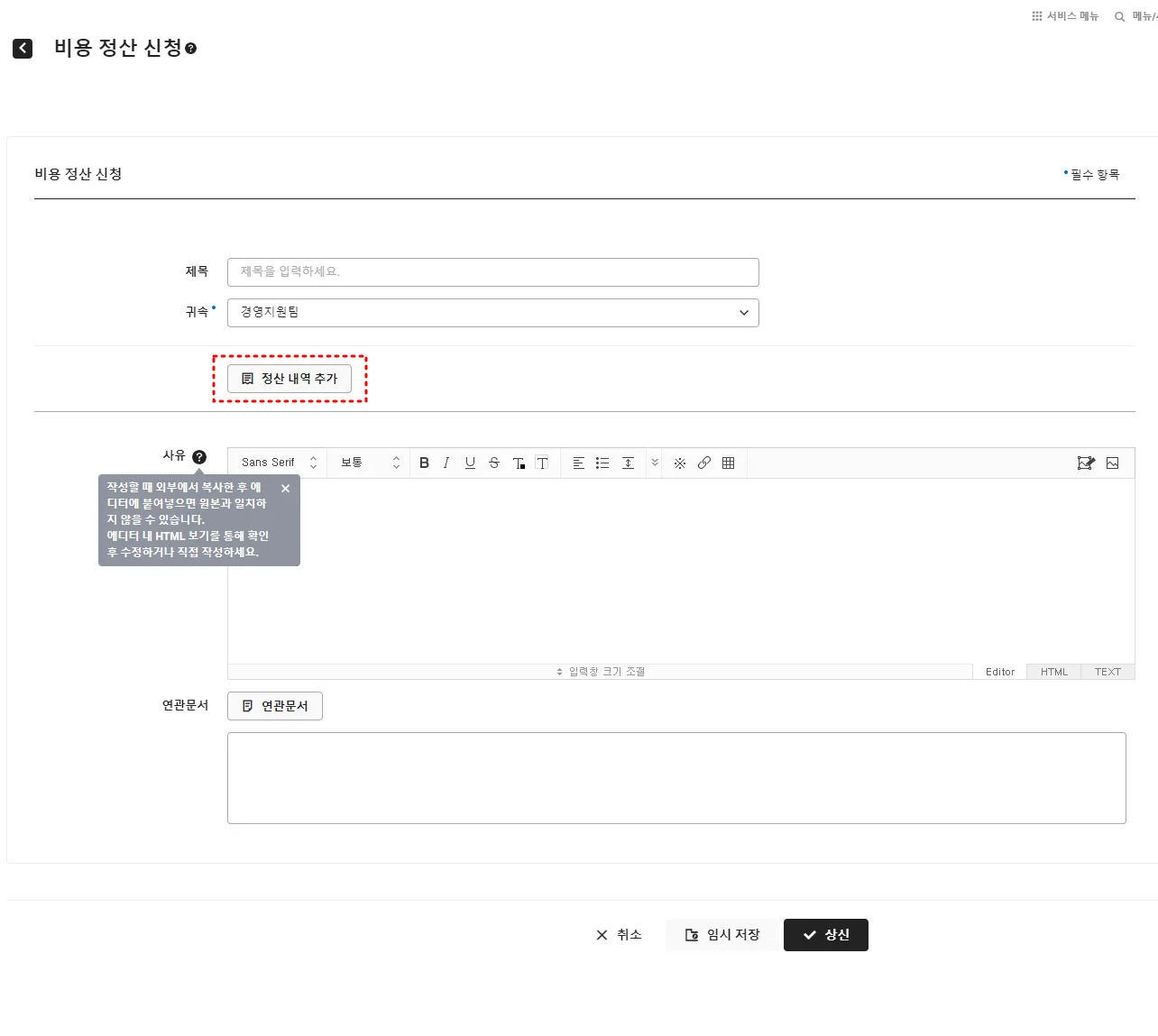 비용 정산 신청 화면에서 [정산 내역 추가] 및 필수 항목 입력 후 신청하면 끝~