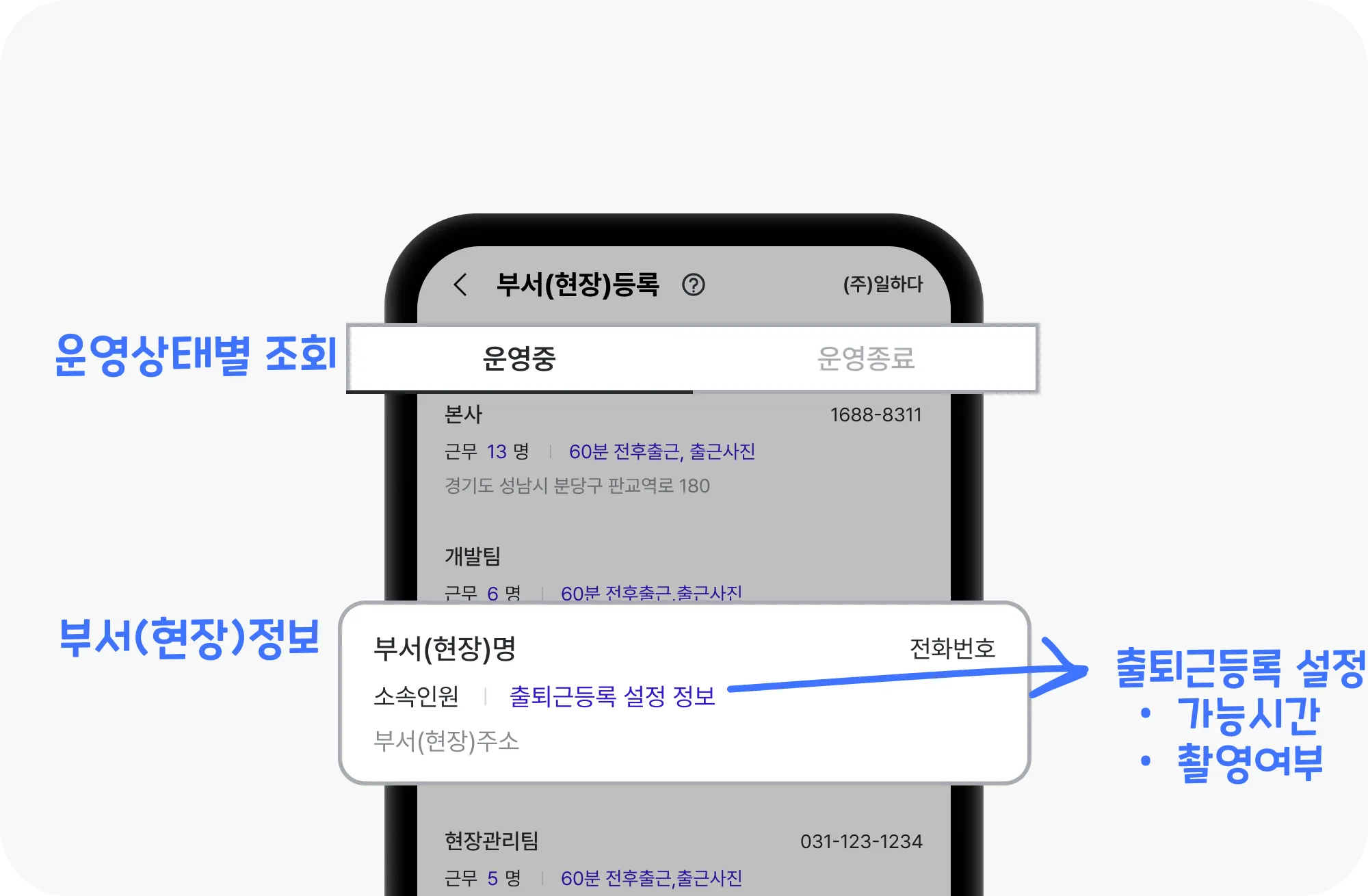 업무부서나 현장을 등록 및 관리하는 메뉴입니다. 각 부서(현장)의 운영기간을 설정하고 각 부서(현장)별 출/퇴근 등록 설정을 할 수 있어요.
