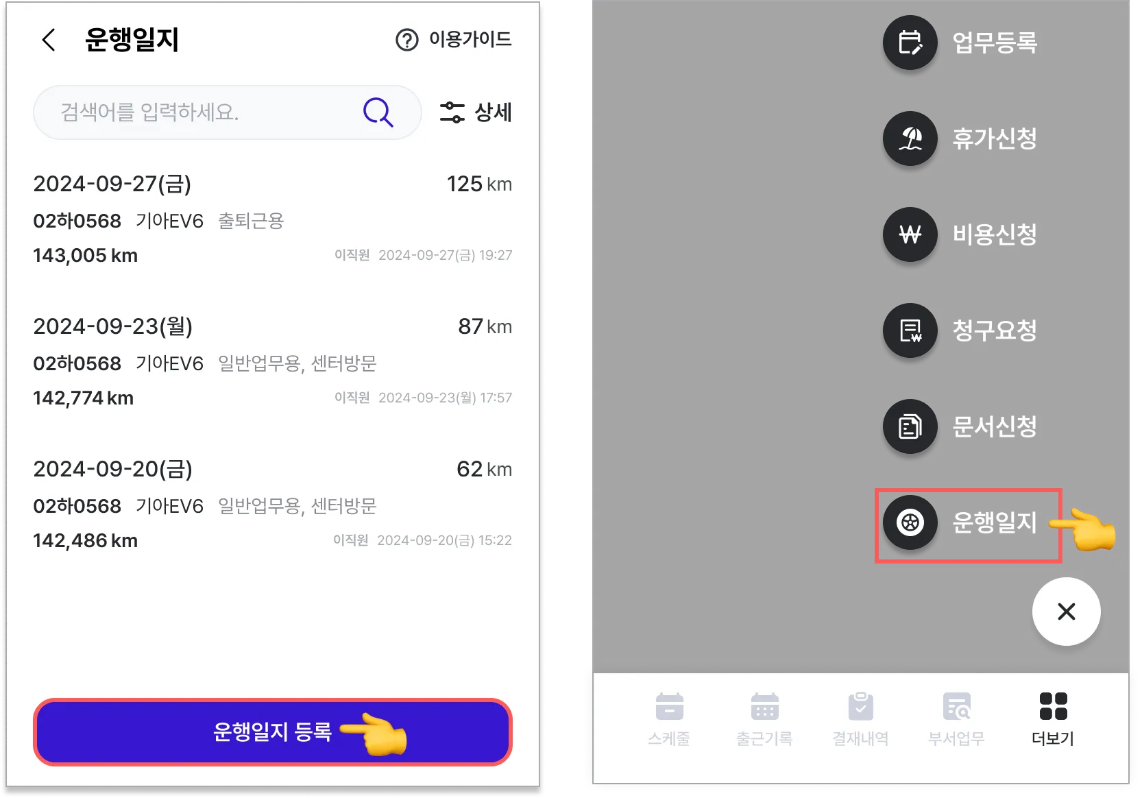 차량, 일자, 주행거리, 사용목적을 입력 후